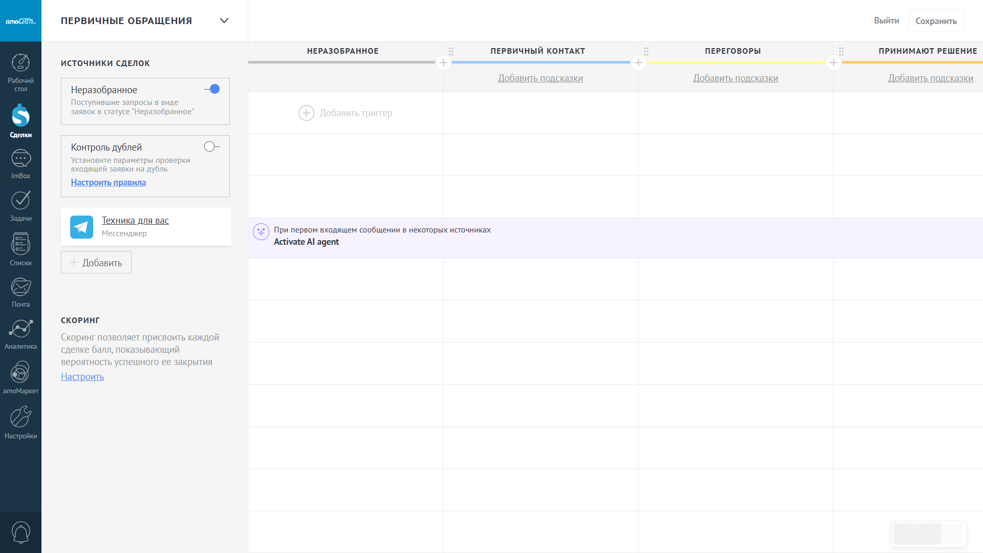 В выбранных воронках и этапах будет добавлен триггер AI агента при входящем сообщении.