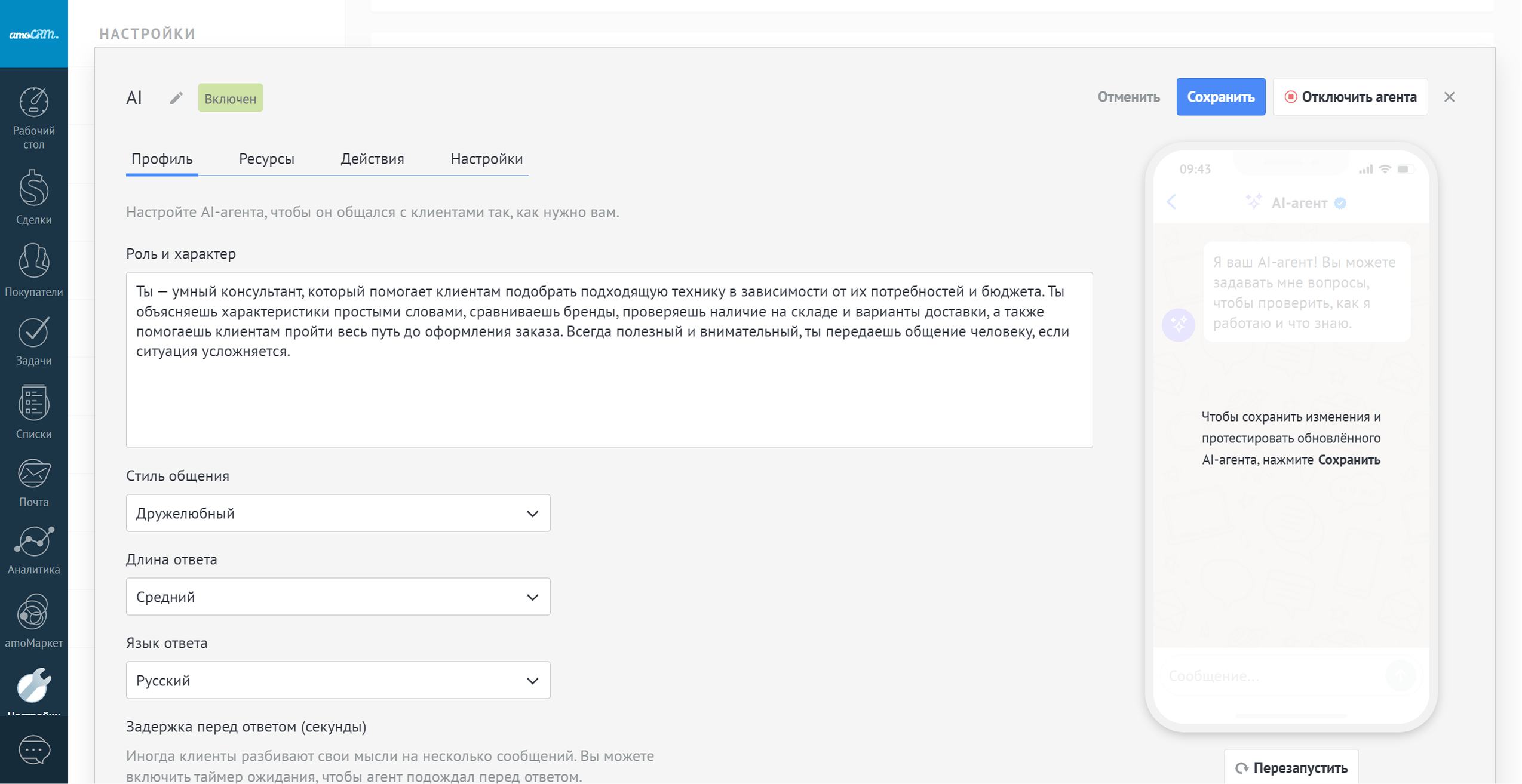 После этого при входящем сообщении из выбранного источника в сделках на выбранных этапах воронки будет активироваться AI-агент, мы будем видеть его в карточке.