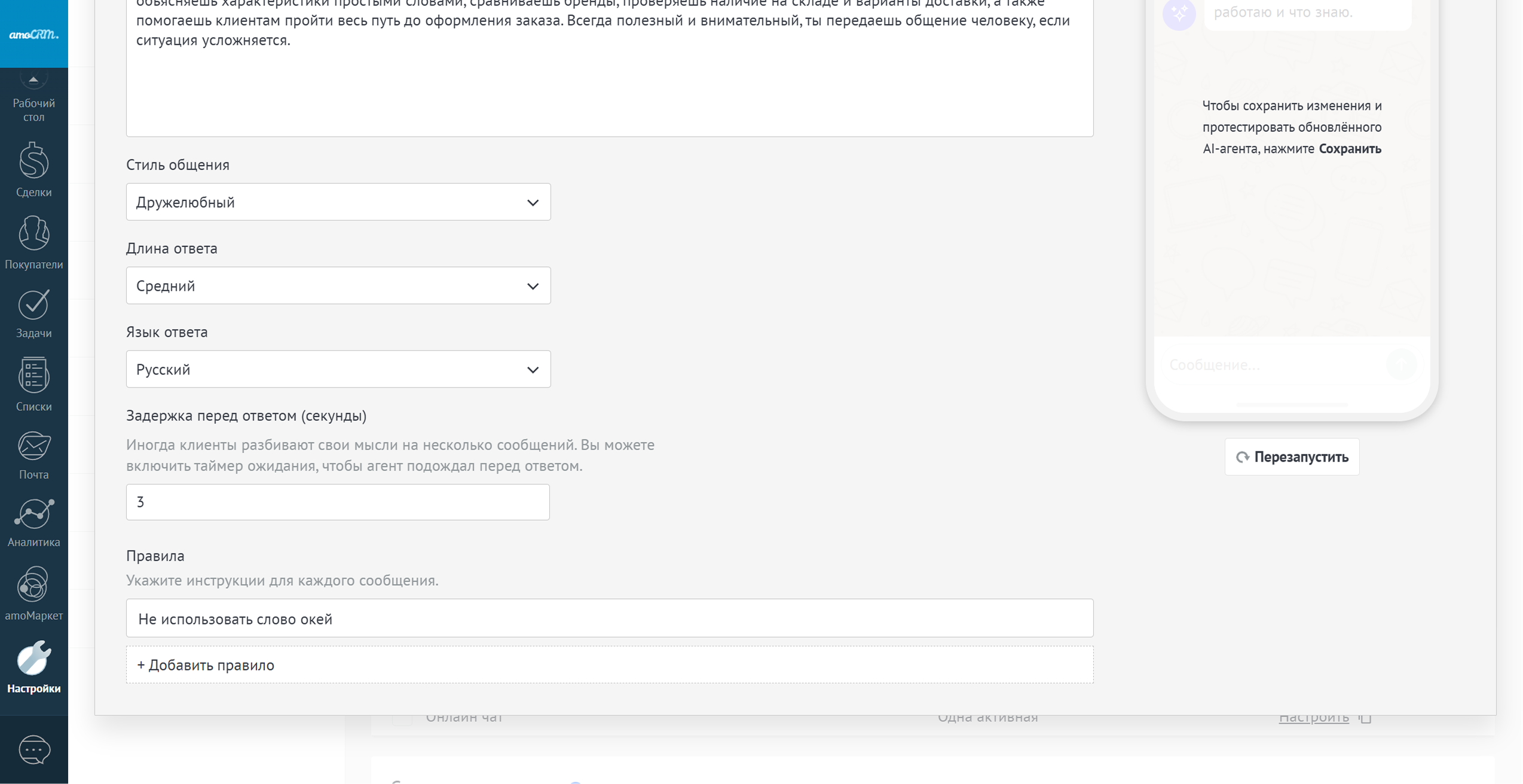 Так же в этом разделе можно указать задержку, с которой AI-агент будет отвечать на входящие сообщения и дополнительно указать особые правила, по которым будет общаться AI-агент, например не использовать какие-либо слова или фразы, представляться особым образом.