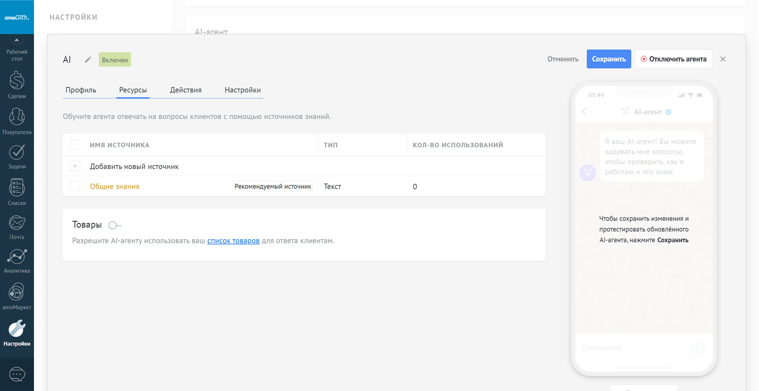 После успешного подключения AI-агента, он отобразится в списке. При клике на название подключенного агента откроется окно его настроек.