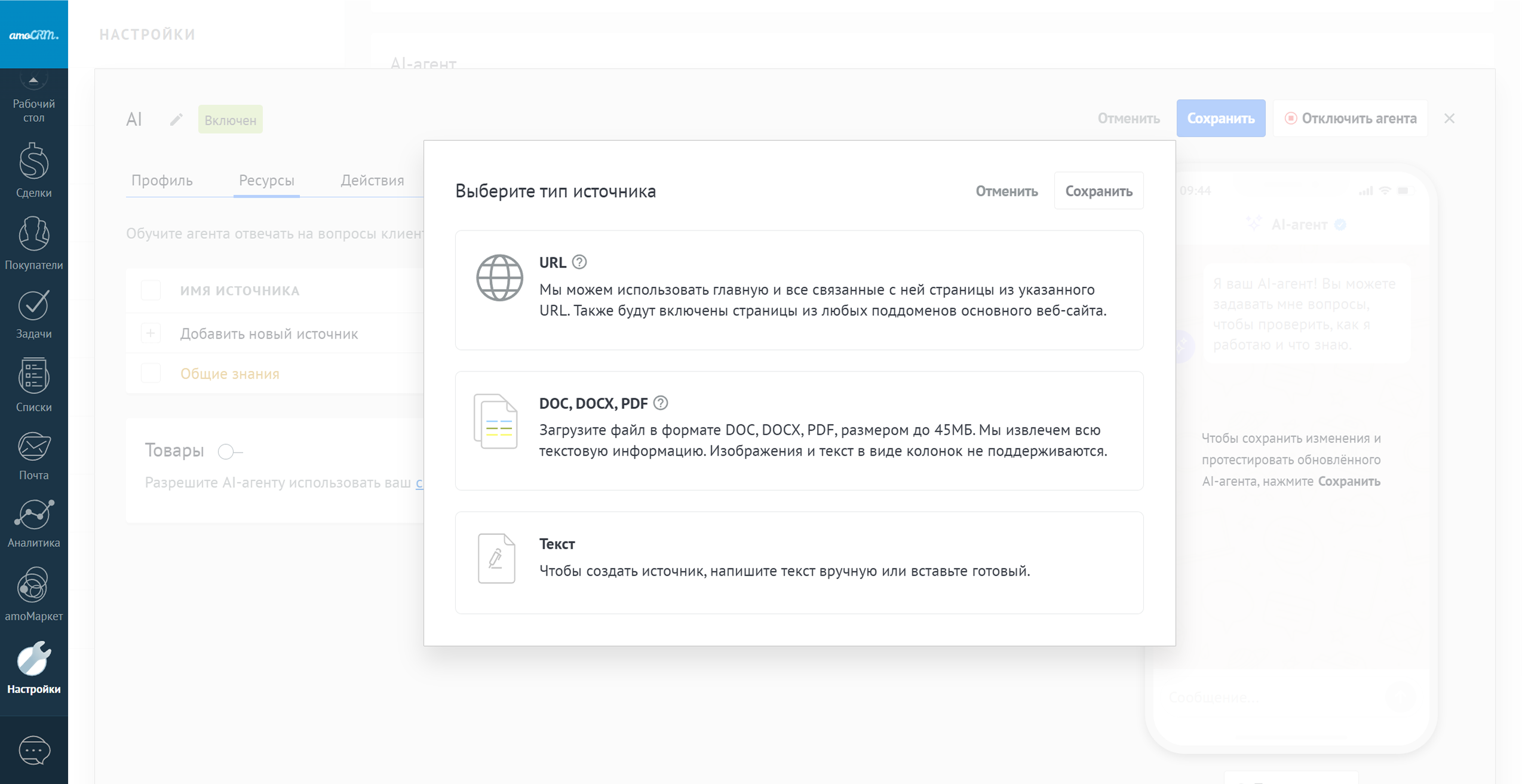 В данном разделе мы можем добавить источники, с которыми будет работать AI-агент, а также предоставить доступ к каталогу товаров вашего аккаунта. Источники поддерживаются трех типов: “URL”, “DOC, DOCX, PDF” и “Текст”