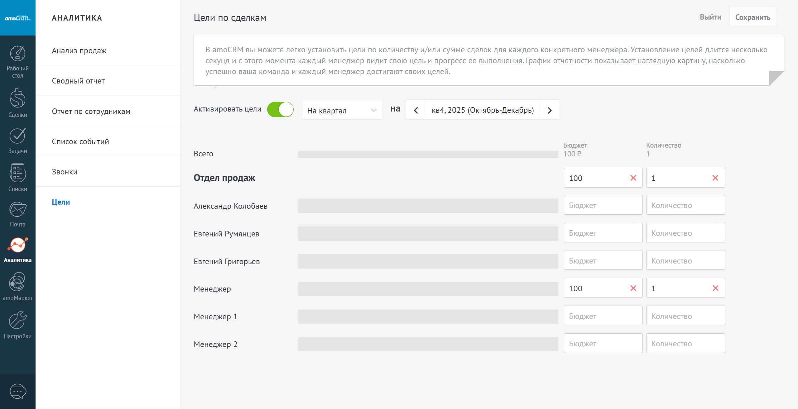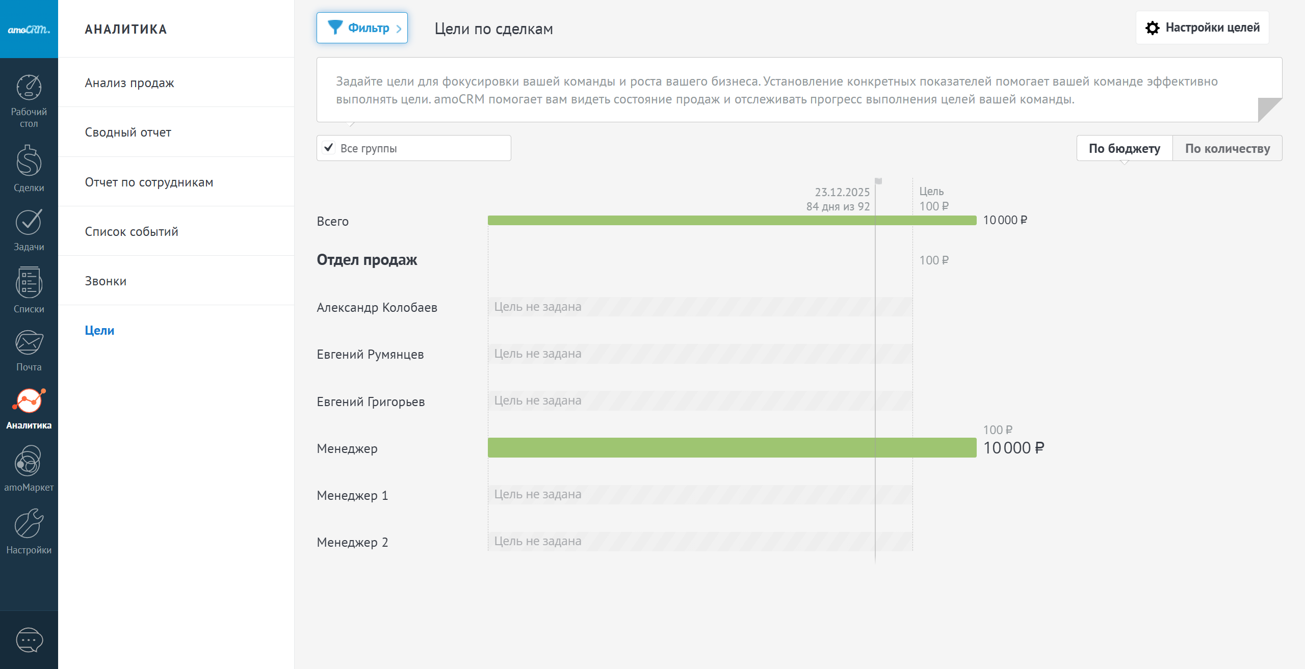 Если у вас создано несколько групп пользователей, цели можно устанавливать на группу. При этом они автоматически распределятся поровну между пользователями.