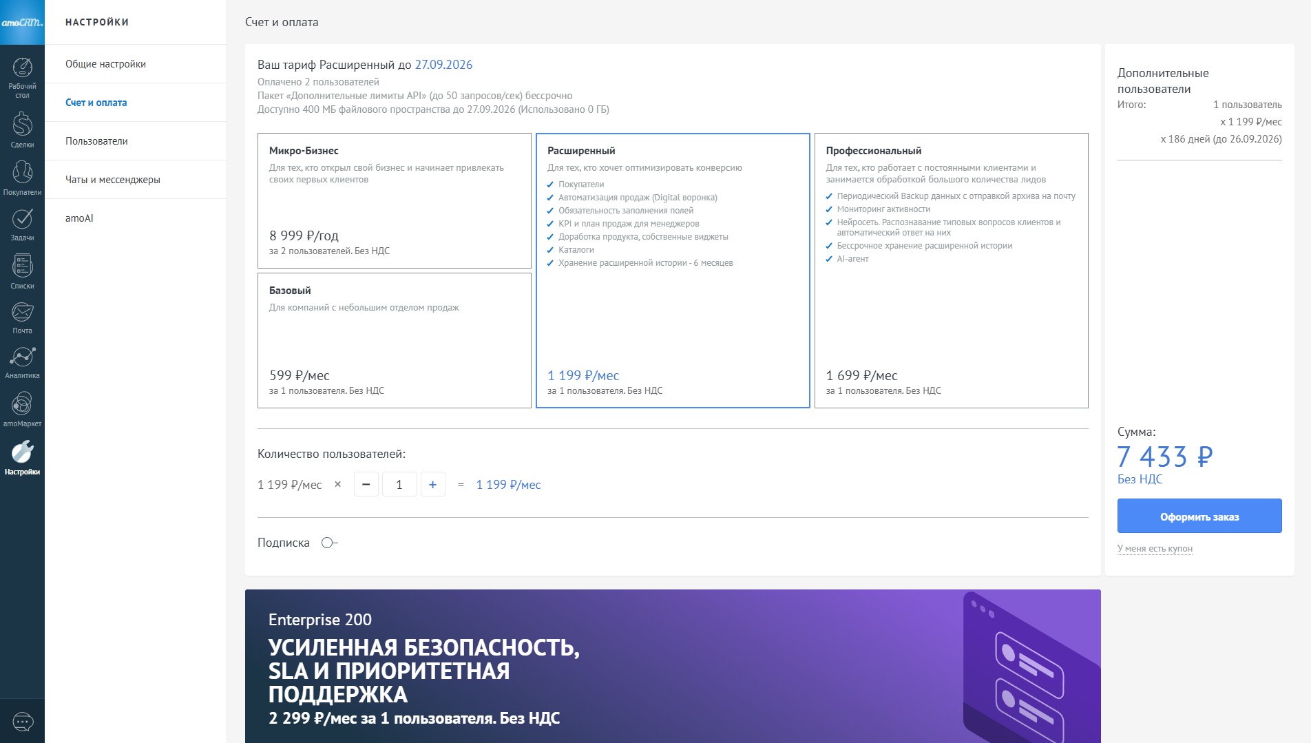 Чтобы докупить пользователей по тарифу, необходимо перейти в раздел “Настройки” на левой панели, нажать на подраздел “Счет и оплата”.