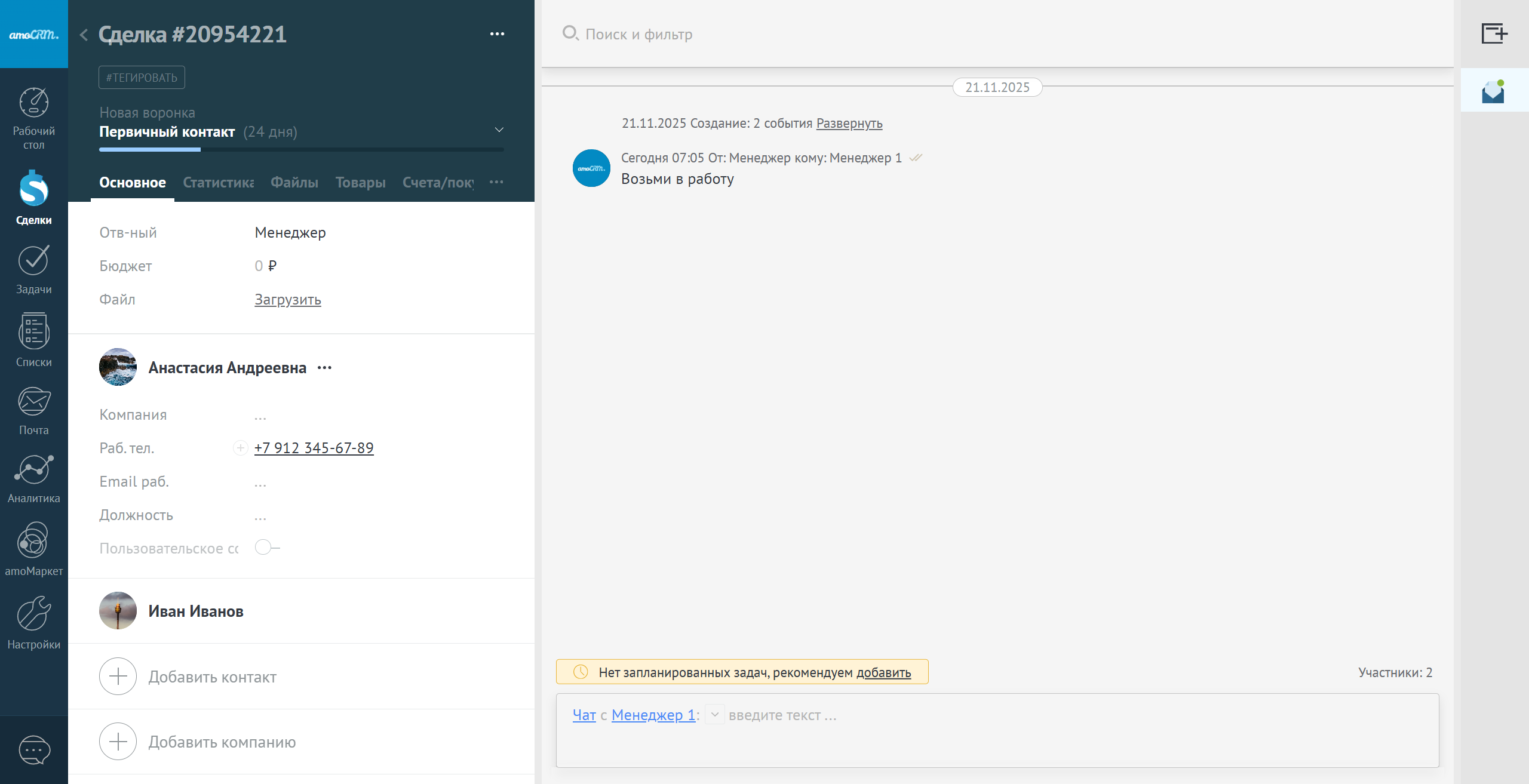 Сообщение создаст уведомление пользователю или группе пользователей в центре нотификаций, а так же добавит пользователя или группу как участника/участников сделки.