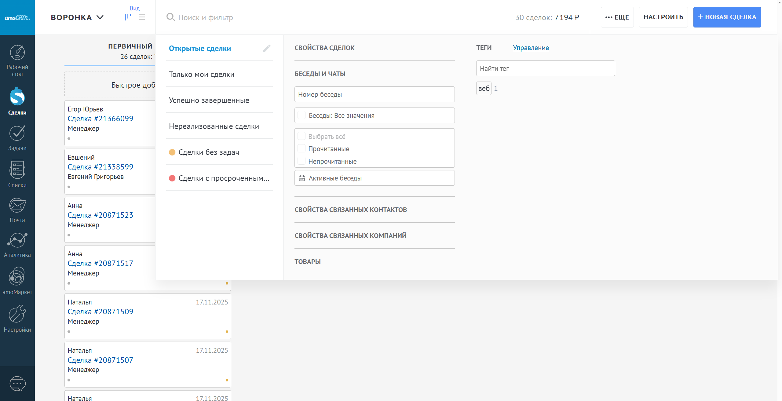 В фильтре раздела сделки, можно отфильтровать сделки с прочитанными беседами. Если используется раздел ImBox вы можете отфильтровать в этом разделе беседы по статусу прочтения.