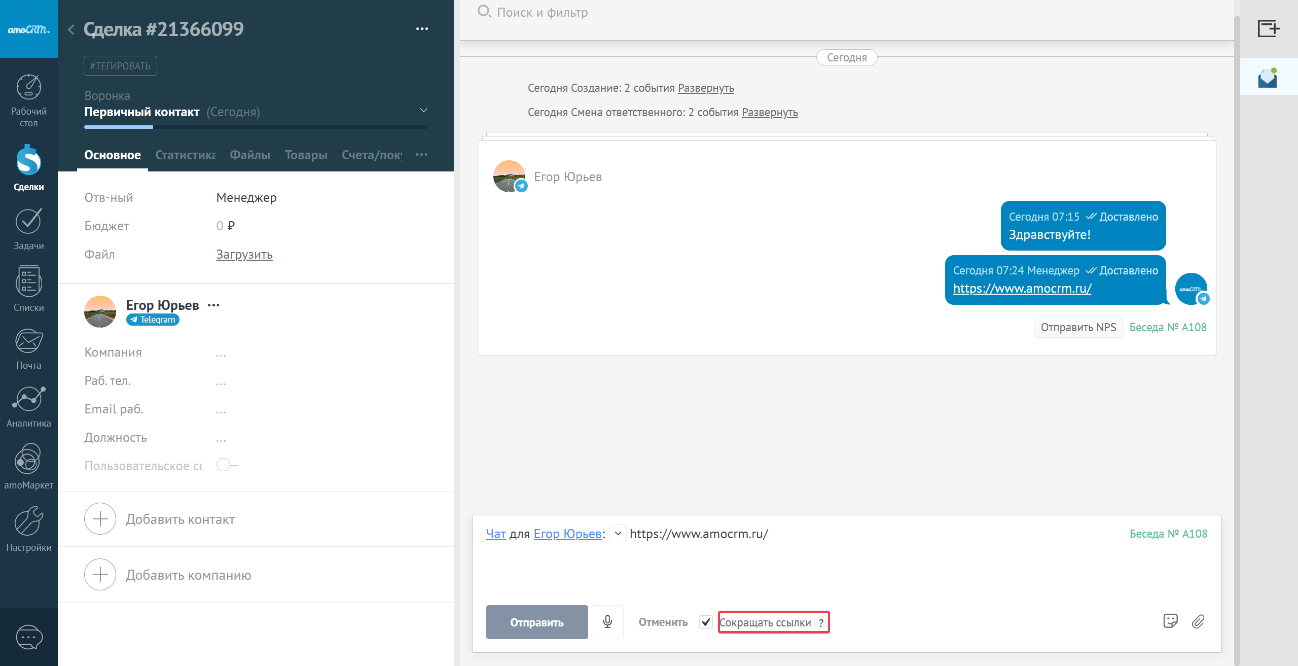 В amoCRM есть возможность сокращать ссылки при отправке в каналы связи, благодаря этой функции вы сможете отследить переход человека по ссылке. При отправке с включенной галочкой - ссылка подменяется.