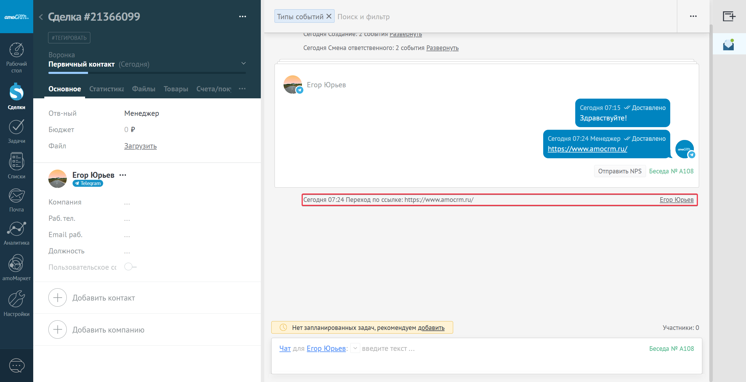 При переходе по такой ссылке будет добавлено примечание в контакт о переходе по ссылке.