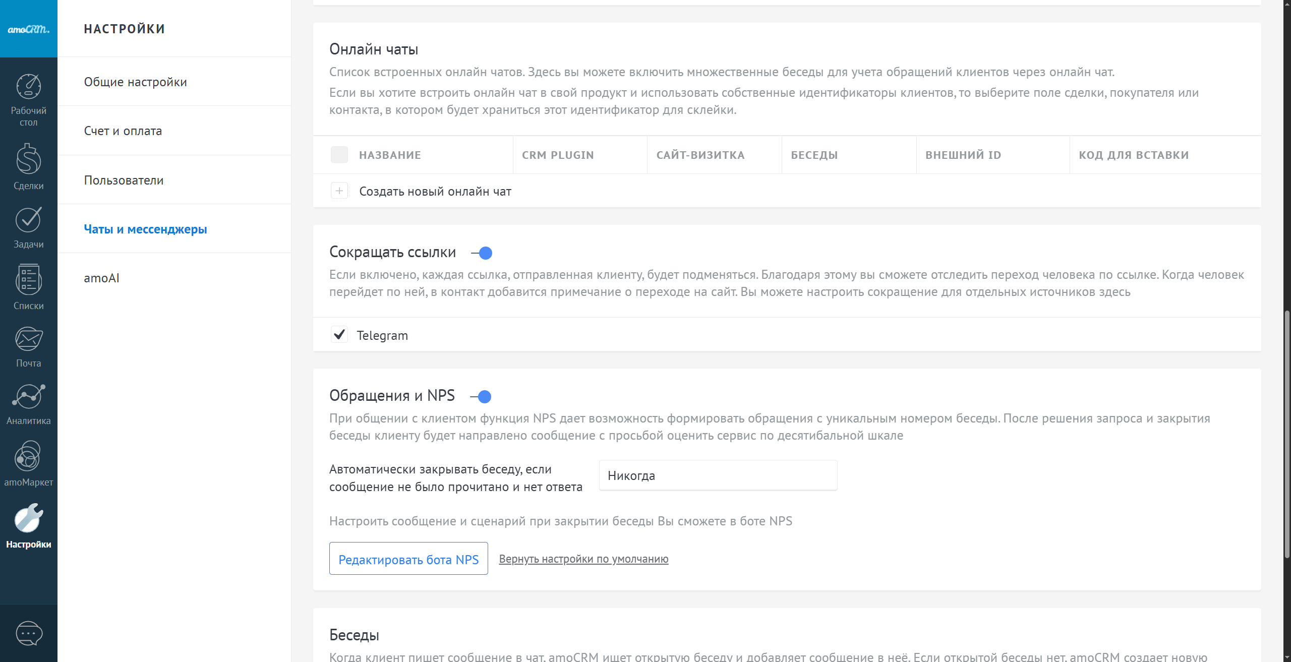 Также в разделе "Настройки" - "Чаты и мессенджеры" можно настроить правила создания новой беседы или включить создание события "превышено время на ответ", если время ответа больше, чем настроенное вами. Если у контакта нет ни одной сделки или покупателя в аккаунте - новая беседа всегда создаст новую сделку.