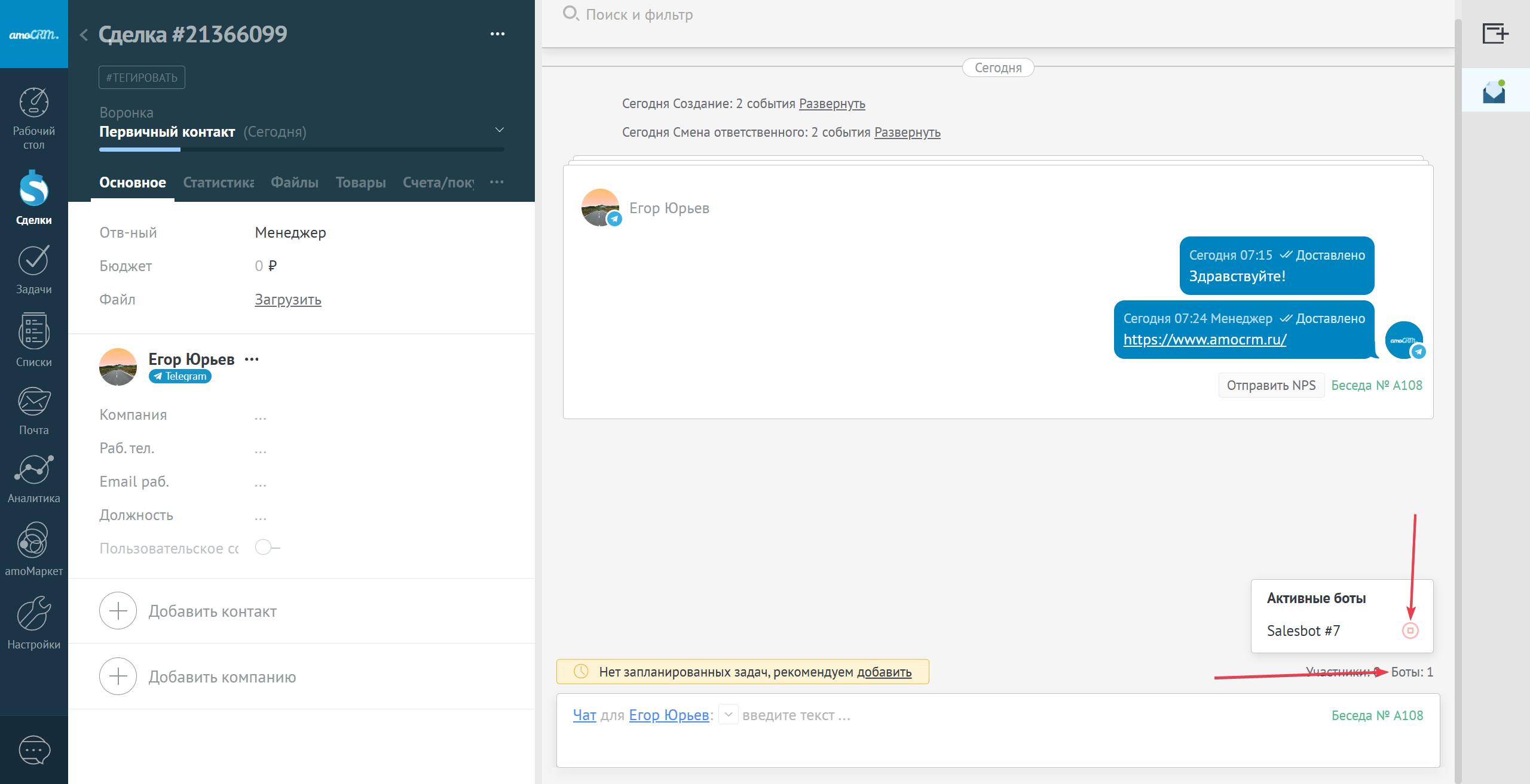 Также в карточке сделки есть возможность просмотреть какой бот работает со сделкой. Можно принудительно остановить работу бота, если нажать на красный значок справа от названия работающего бота. При нажатии на название бота, есть возможность перейти к просмотру его сценария и его редактированию
