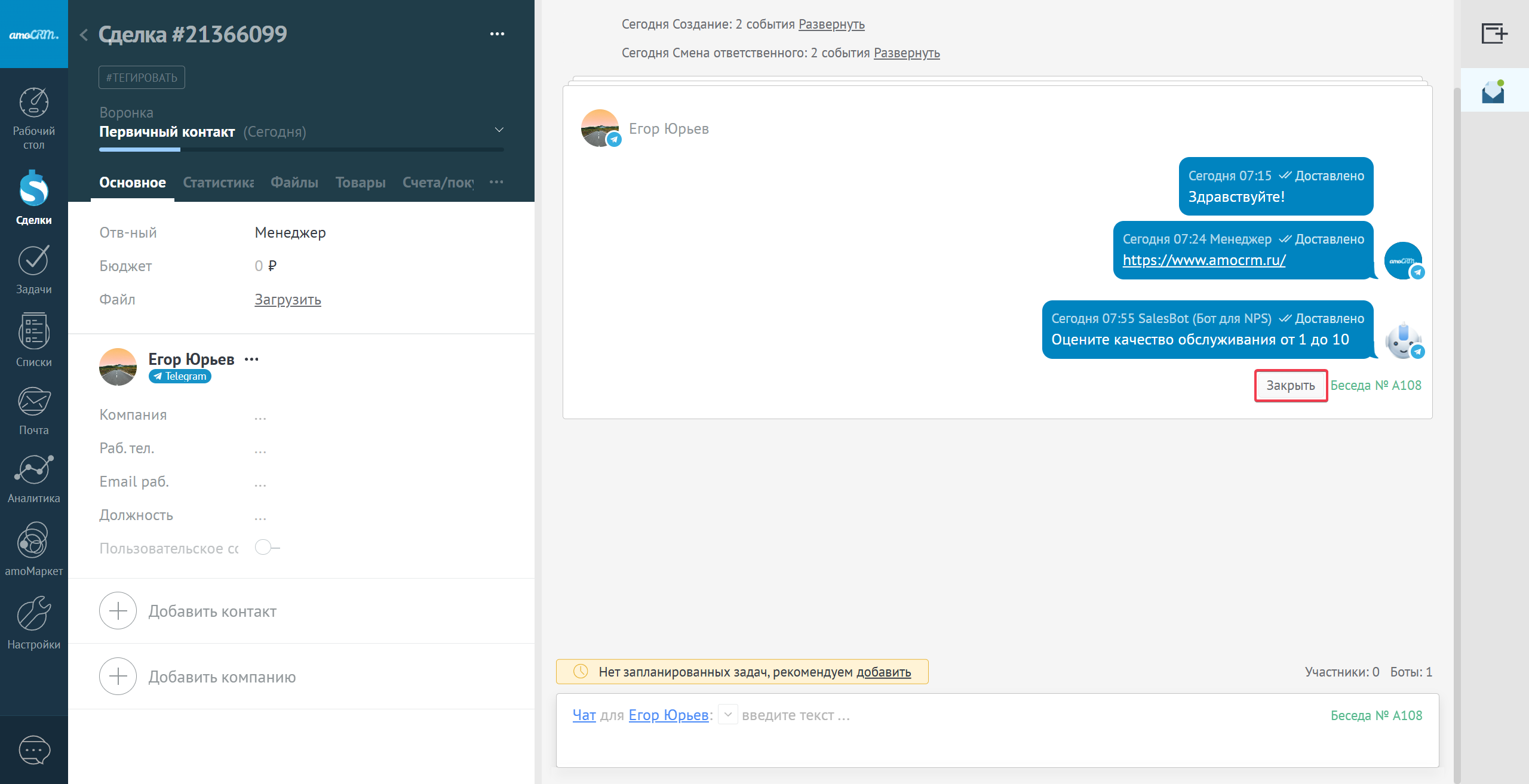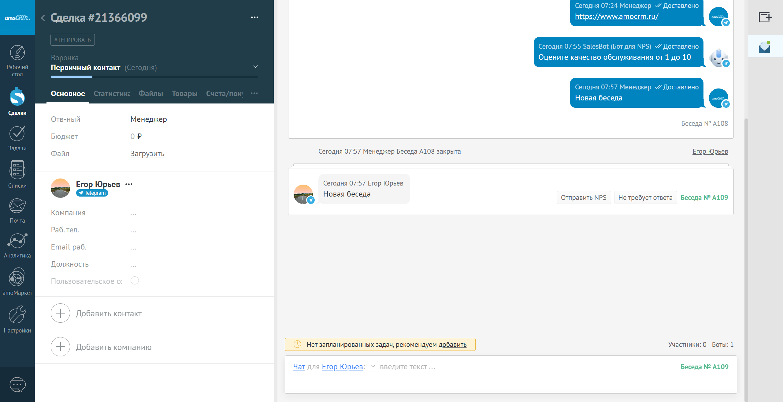 Важно, что создание беседы исходящим сообщением системно не создаст сделки, данное правило распространяется только на беседы, созданные входящим сообщением.