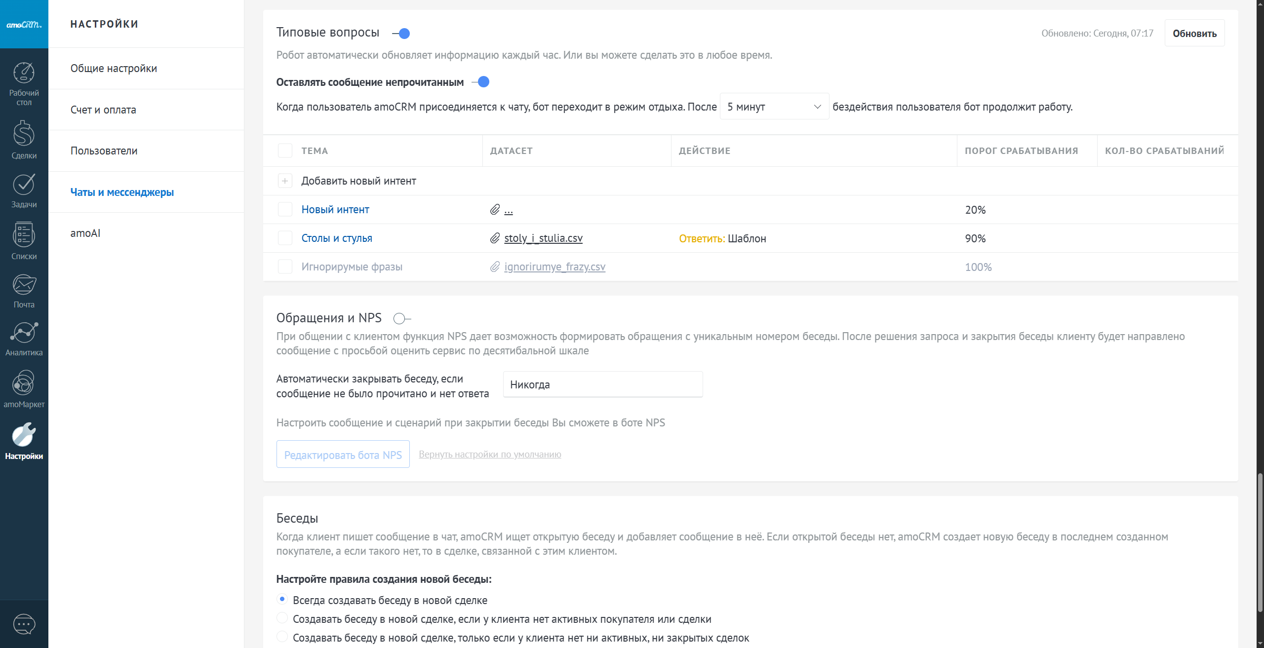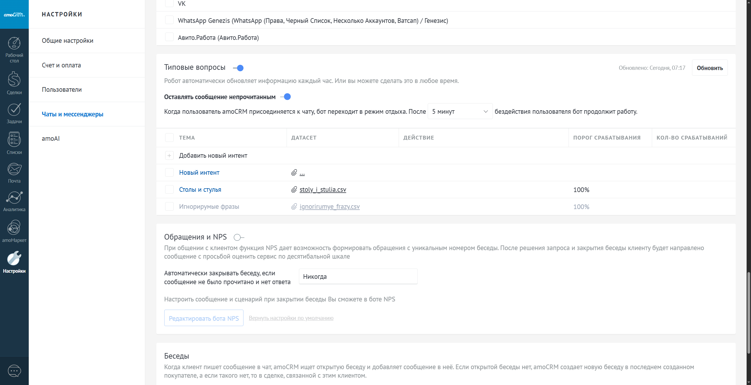 Типовые вопросы (нейросеть) помогают оперативно отвечать клиентам на часто задаваемые вопросы из сообщений в мессенджерах.