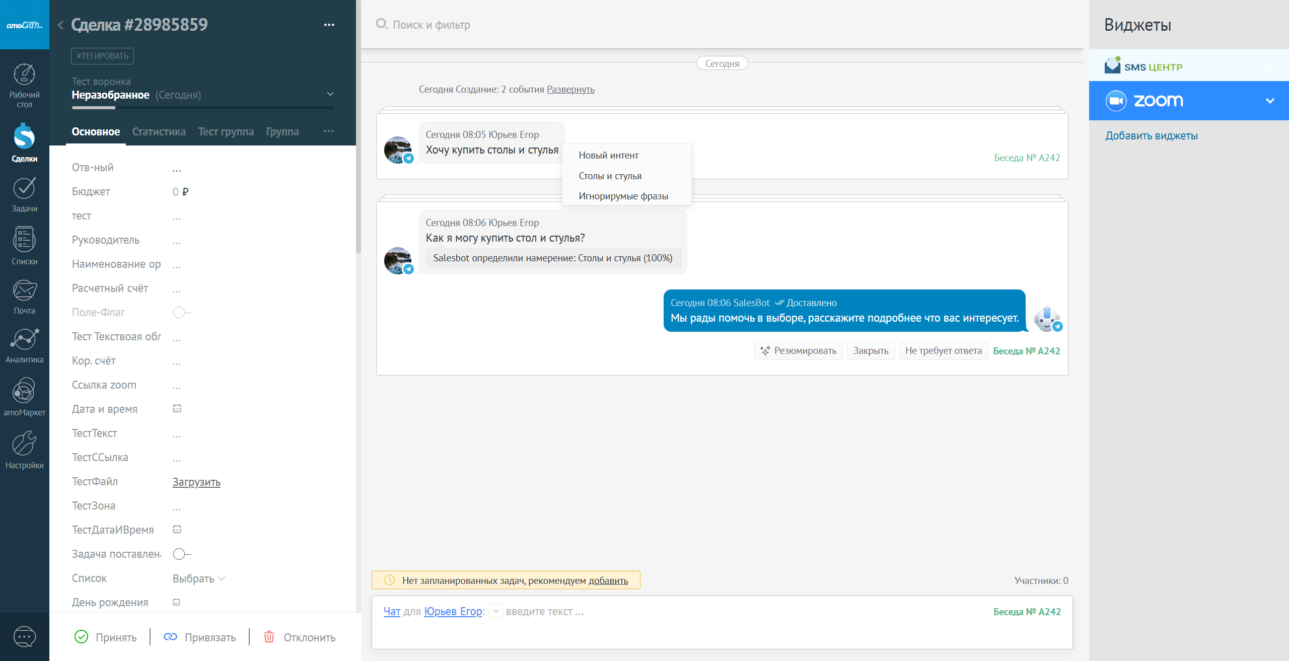 3. Действие - это действия, которые надо сделать по выбранной тематике. Здесь у нас будет работать или настроенный сценарий Salesbot или выбранный нами шаблон.