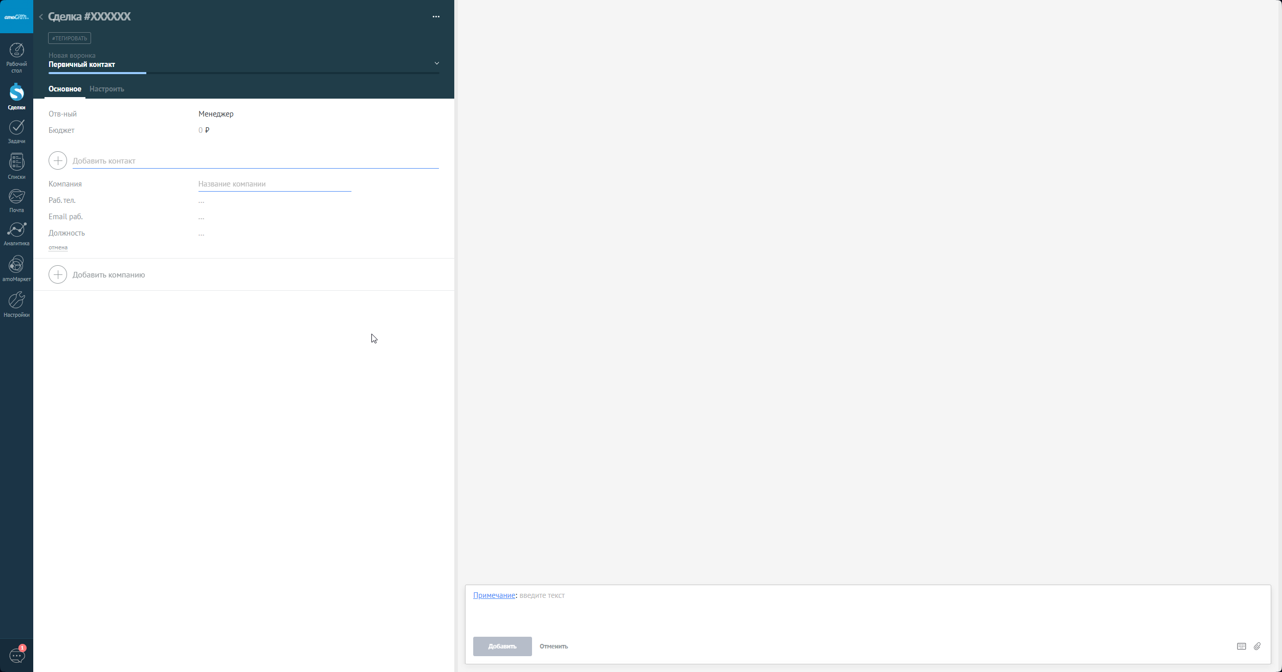 Карточка сделки разделена на две части. В левой части вы вводите всю информацию о сделке, о связанных с ней контактах и компании. В следующих разделах мы расскажем, как добавлять собственные поля в карточку и настраивать ее под себя. Справа – лента событий. В ней фиксируется вся история работы со сделкой. Звонки, задачи, примечания, чаты, даже изменения полей и многое другое.