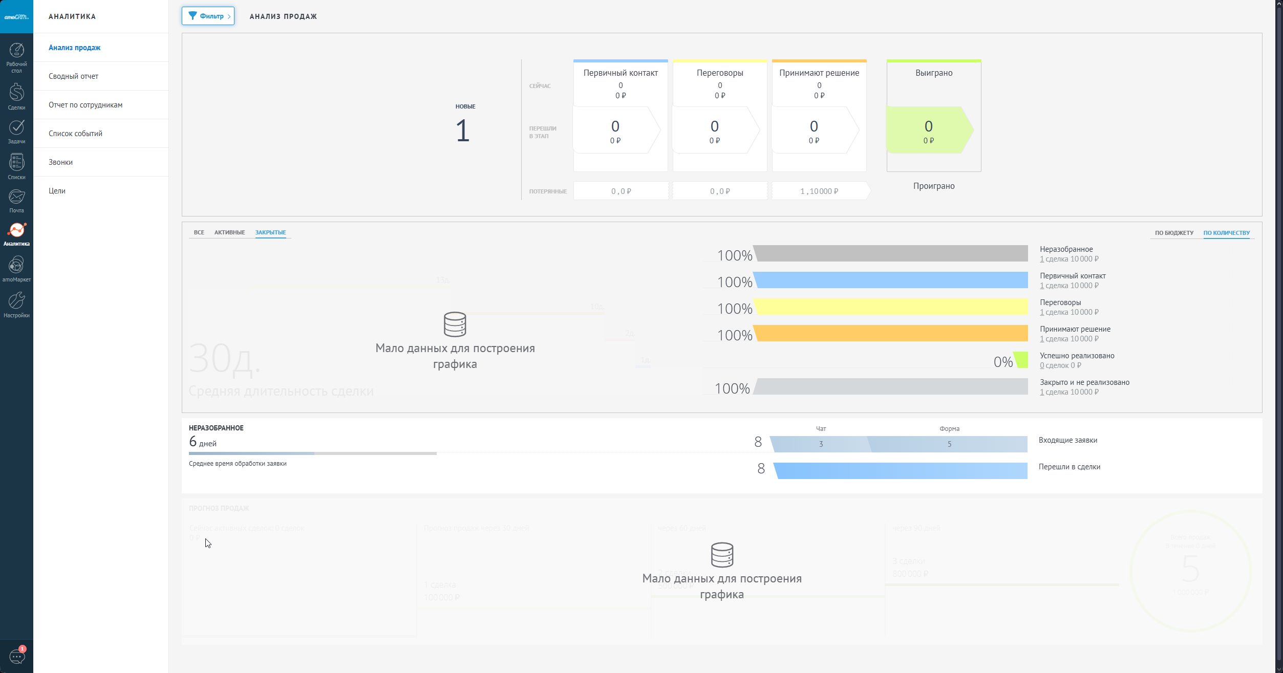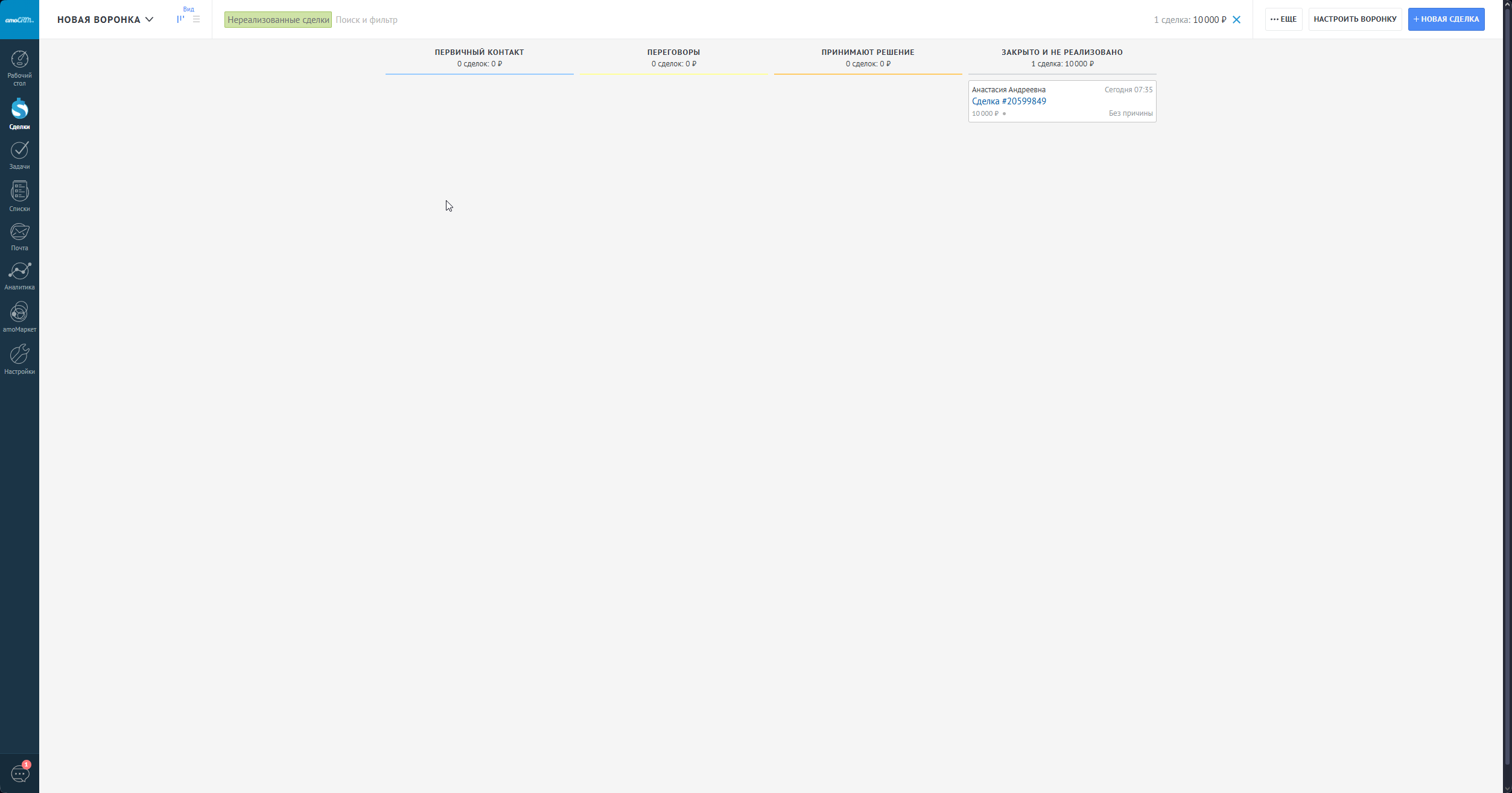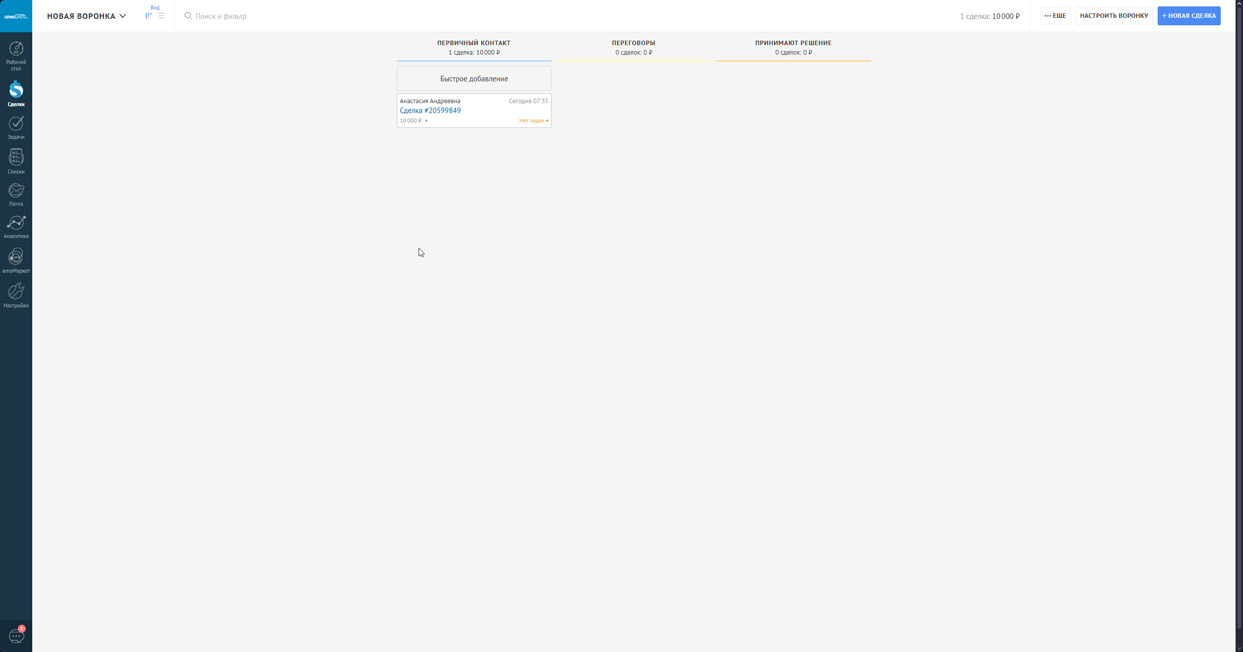 После того, как мы настроили воронку продаж, давайте попробуем создать нашу первую сделку провести ее по воронке и увидеть, как это отобразится в Аналитике.